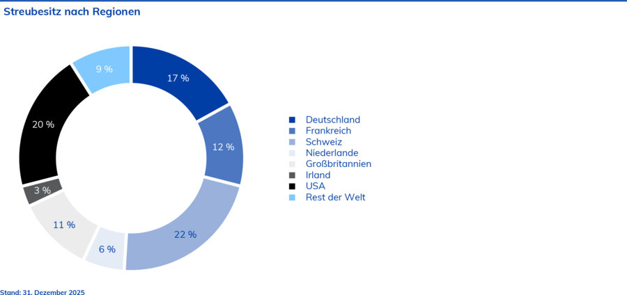 Zum Ende des aktuellen Berichtsjahres befanden sich 0,11 % (31. Dez. 2024: 0,04 %) der Aktien im Besitz des Managements und Aufsichtsrats. Weitere 8,71 % (31. Dez. 2024: 7,18 %) wurden von Privatanlegern gehalten. Der Rest in Höhe von 91,19 % entfiel auf institutionelle Investoren (31. Dez. 2024: 92,78 %). Die Zahl der Privatanleger lag zum Ende des Geschäftsjahres 2025 bei 7.244 (31. Dez. 2024: 6.742).