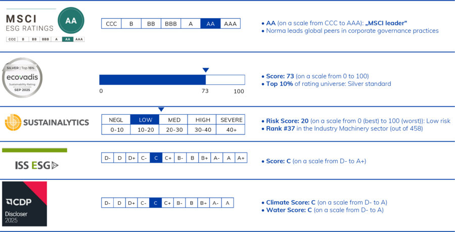 Innerhalb der Bewertung von Nachhaltigkeitsthemen werden auch die an uns gestellten Anforderungen unserer wichtigsten Stakeholder innerhalb ausgewählter ESG-Ratings berücksichtigt. Die NORMA Group strebt hier eine kontinuierliche Verbesserung der Ergebnisse an (freiwillige Angabe nach ESRS 1.114):