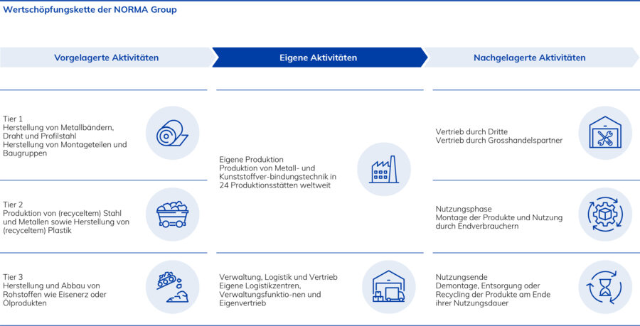 Zentrale Bausteine der Wertschöpfungskette der NORMA Group sind Human Resources, d. h. Mitarbeitende der NORMA Group selbst, sowie Beschäftigte vor- oder nachgelagerter Unternehmen. Die NORMA Group berücksichtigt die wichtigsten Wertschöpfungsketten in ihrer Geschäftstätigkeit: In der vorgelagerten Wertschöpfungskette werden hierzu Beschäftigte der direkten Lieferanten der NORMA Group betrachtet. Besonders relevant sind Lieferantengruppen unter anderem aus dem Bereich Stahl- und Metallkomponenten sowie Granulate und Kunststoffe. Weitere Erläuterungen hierzu finden sich im Kapitel EINKAUF UND LIEFERANTENMANAGEMENT. In der nachgelagerten Wertschöpfungskette werden Kunden, Verbraucher und Endnutzer betrachtet. Besonders relevant sind Kundengruppen in den SBUs Mobility & New Energy wie auch Industry Applications. Beschäftigte im Eigenbetrieb umfassen sowohl die Mitarbeitenden der NORMA Group als auch Mitarbeitende der Dienstleister, die Tätigkeiten auf dem Betriebsgelände ausführen. Zudem werden betroffene Gemeinden und Kommunen, insbesondere jene in der Nähe der Produktionsstandorte, berücksichtigt. Durch diese Betrachtung möchte die NORMA Group gewährleisten, dass nachhaltige Prinzipien entlang dieser Teile der Wertschöpfungskette integriert und umgesetzt werden und alle relevanten Stakeholder analysiert werden.
