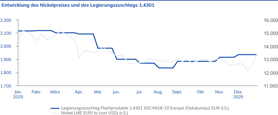 Im Raum Asien-Pazifik – und dort vor allem in China – konnten ebenfalls niedrigere Bezugspreise für Edelstahlprodukte ausgehandelt werden. Dabei ist jedoch anzumerken, dass Preisreduzierungen in den dortigen Verhandlungen insgesamt geringer ausfielen als in der Region EMEA. Im 2. Halbjahr 2025 mussten zudem leicht erhöhte Preise im Vergleich zum 1. Halbjahr entrichtet werden. Im dortigen Preismodell erfolgt im Gegensatz zum Rest der Welt keine Separierung der Rohstoffkomponenten über einen Legierungszuschlag.