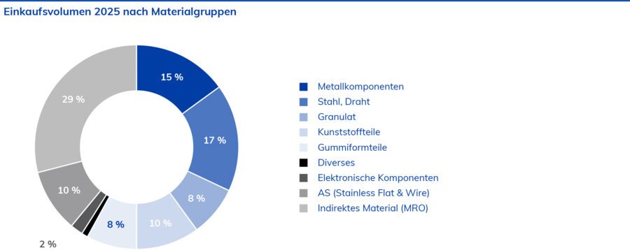 Auch im Geschäftsjahr 2025 war die Versorgung der weltweiten Produktionsstandorte mit Rohstoffen wie Stahl und Draht sowie Metallkomponenten – bis auf wenige Ausnahmen – sehr gut. Auch die anhaltenden geopolitischen Krisen hatten keinen nennenswerten negativen Einfluss auf die Materialverfügbarkeit. Die nachlassende Konjunktur auf allen Kontinenten führte schrittweise zu einem Rückgang der Nachfrage in wichtigen Industriesegmenten und damit zu einer geringeren Auslastung der meisten Lieferwerke. Die Lieferzeiten für Stahl- und Drahtprodukte normalisierten sich im Jahresverlauf auf wenige Wochen. Bei Metallkomponenten lagen die Lieferzeiten hingegen weiterhin bei mehreren Monaten, bedingt durch mehrstufige Fertigungsschritte einschließlich der häufig erforderlichen Oberflächenbeschichtung. Eine Normalisierung der Energiepreise in Europa führte dazu, dass keine Teuerungszuschläge erhoben wurden – abgesehen von den etablierten Legierungszuschlägen bei Edelstählen.