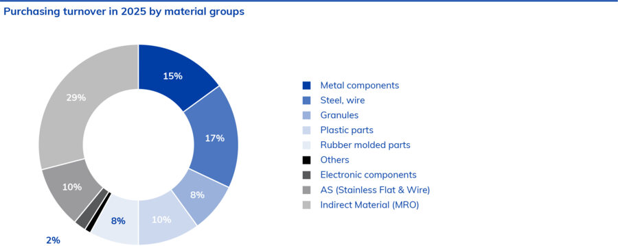 In fiscal year 2025, the supply of raw materials such as steel, wire, and metal components to global production sites remained very good, with only a few exceptions. Even the ongoing geopolitical crises had no significant negative impact on material availability. The economic slowdown on all continents gradually led to a decline in demand in key industrial segments and consequently to lower capacity utilization at most supplier plants. Delivery times for steel and wire products normalized to a few weeks over the course of the year. However, delivery times for metal components remained at several months due to multi-stage manufacturing processes, including the frequently required surface coating. A normalization of energy prices in Europe meant that no price increases were levied apart from the established alloy surcharges for stainless steels.